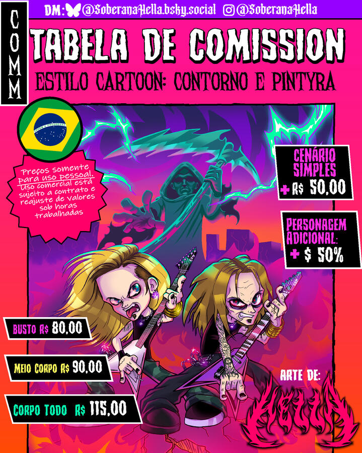 Importante salientar que os preços descritos neste catálogo podem variar dependendo do grau de detalhes da arte. Os preços descritos são os mínimos a serem cobrados pelas artes e podem aumentar de acordo com a natureza do projeto e poder aquisitivo da entidade contratante.Pagamento: